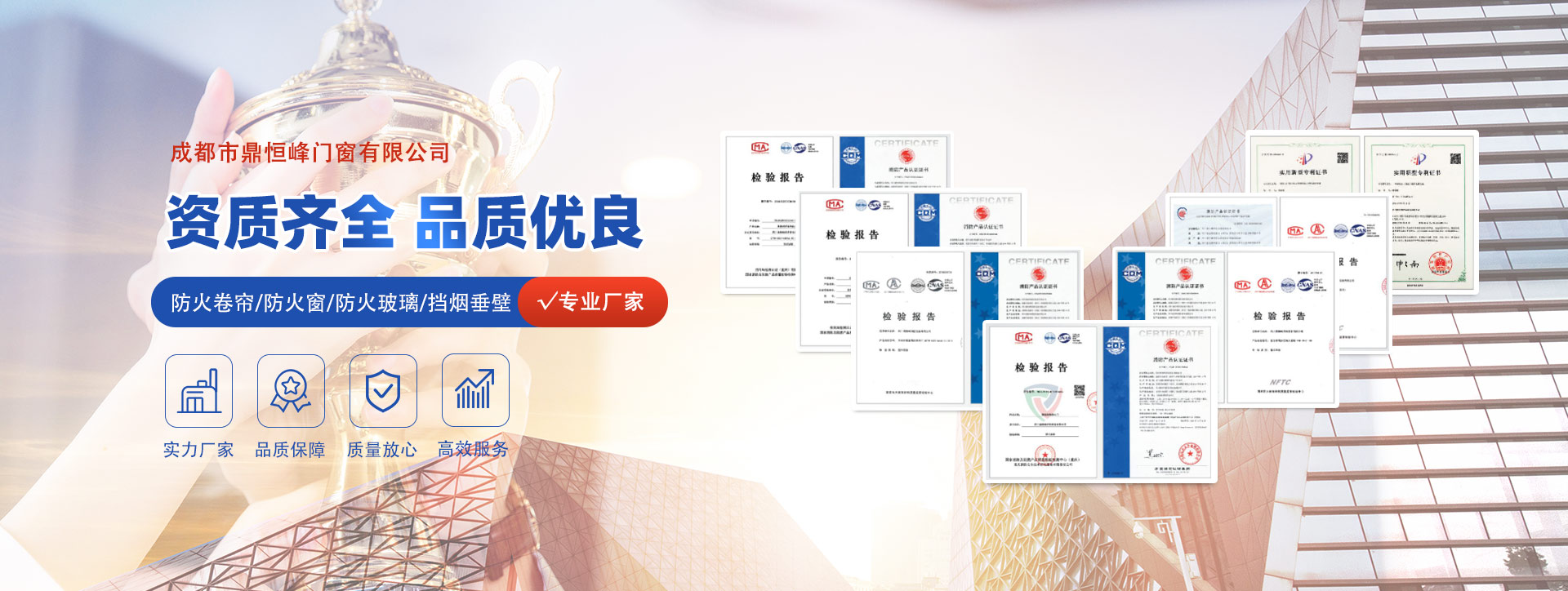 成都市鼎恒峰門窗有限公司公司擁有的生產、檢測設備和一支實力雄厚、經驗豐富的設計研發(fā)、管理、生產、銷售、安裝及售后服務的戰(zhàn)狼團隊,有完善的綜合配套服務能力。公司主要生產、銷售以下系列產品:防火卷簾系列、防火窗系列、防火玻璃系列、擋煙垂壁系列產品。其產品已通過國家防火建筑材料質量監(jiān)督檢測中心合格,并順利取得了國家應急管理部消防產品合格中心自愿性證書。其中生產銷售的組合式特級防火卷簾在同行中名列前茅,得到用戶的認可和好評。 公司秉承“誠信、開拓、高效、的企業(yè)理念,...